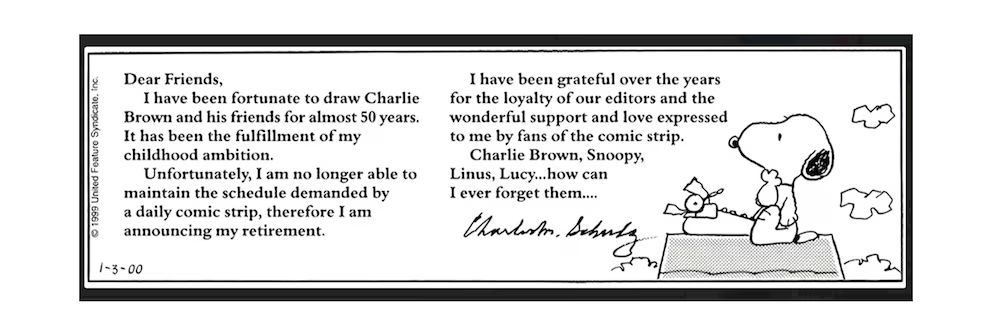 En ese periodo, Peanuts había ingresado al Museo del Louvre y contaba con una exposición permanente en el Museo del Comic de Florida. La última tira diaria apareció el 3 de enero de 2000, publicada en 2.600 diarios de 75 países. En ella, junto a un dibujo de Snoopy y su máquina de escribir, Schulz se despidió con una carta que decía: “Queridos amigos: He tenido la suerte de dibujar a Charlie Brown y sus amigos durante casi cincuenta años. Eso ha significado la realización de mis ambiciones de mi infancia. Desgraciadamente, ya no estoy en condiciones de mantener el ritmo que impone una tira cómica diaria, así que anuncio mi retiro. Durante todos estos años no he sentido sino agradecimiento por la lealtad de nuestros editores y por el apoyo y el cariño maravilloso que me han hecho llegar los seguidores de esta tira cómica. Charlie Brown, Snoopy, Linus, Lucy... ¿cómo podría olvidarlos?”.