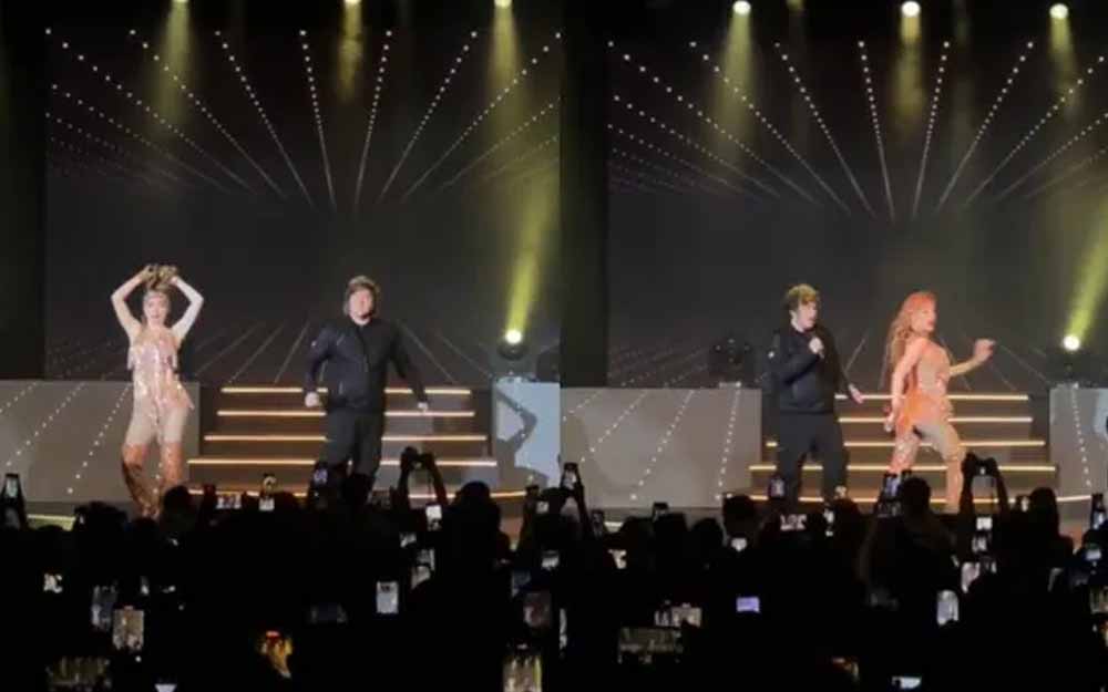 Contra todo protocolo, el Presidente no se quedó sentado entre el público. En un giro sorpresivo, subió al escenario junto a la imitadora y se animó a cantar un fragmento de un clásico de Ratones Paranoicos, El Rock del Gato. La escena despertó aplausos, gritos y una postal inevitable: decenas de celulares levantados registrando el instante.
