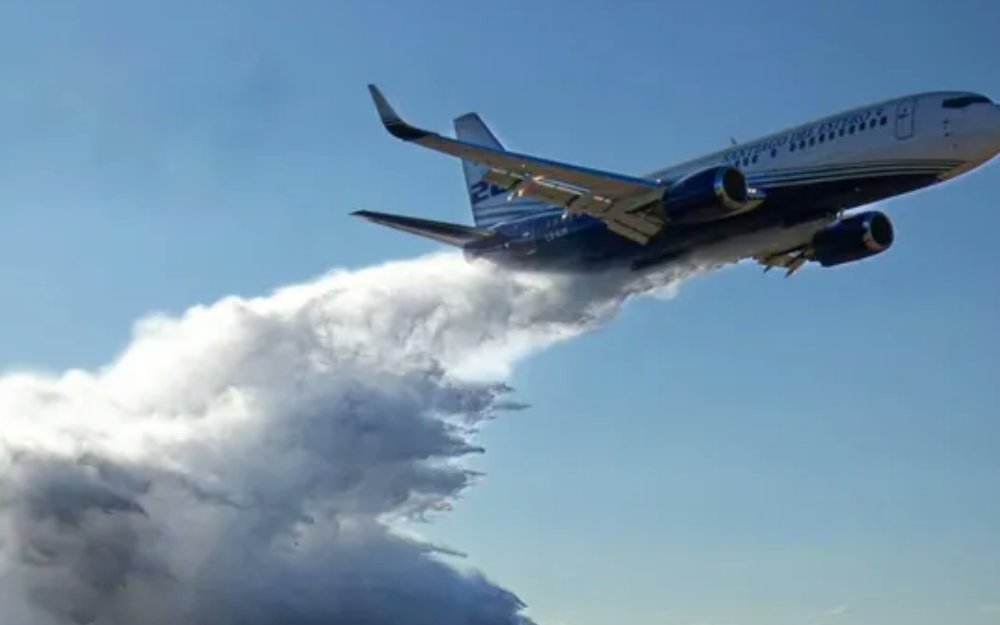 El Gobierno de Santiago del Estero le prestó a Chubut su avión hidrante, un Boeing 737 Fireliner que puede descargar hasta 15.150 litros de retardante.
