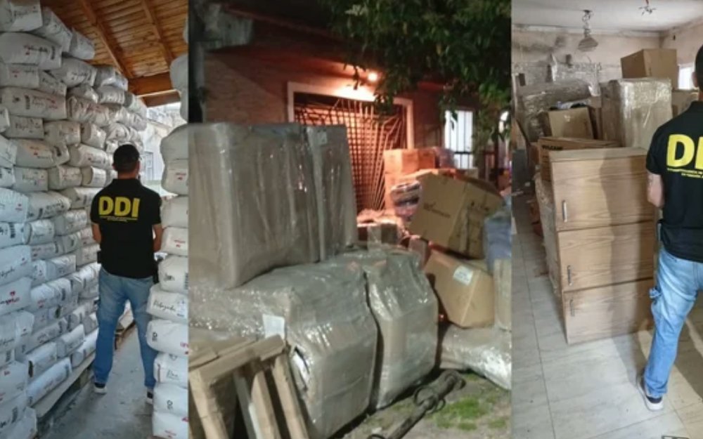 Además de la oficina, se secuestraron siete pallets completos con 554 bolsas de materiales; decenas de bultos y cajas con elementos de construcción; equipamiento gastronómico, mobiliario, iluminación, productos médicos y alimentos; cientos de cajas cerradas, bolsas industriales y bultos sueltos; electrodomésticos, luminarias, muebles y documentación comercial.__IP__