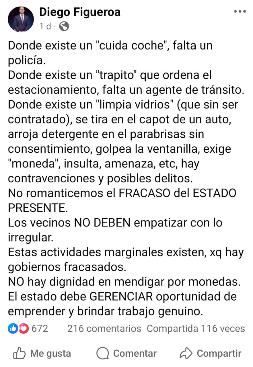El propio concejal señala que “estas actividades marginales existen porque hay gobiernos fracasados” y sostuvo que “no hay dignidad en mendigar por monedas señalando que el Estado debe asumir un rol más activo. “El estado debe gerenciar oportunidades para emprender y brindar trabajo genuino” cerró su posteo.
