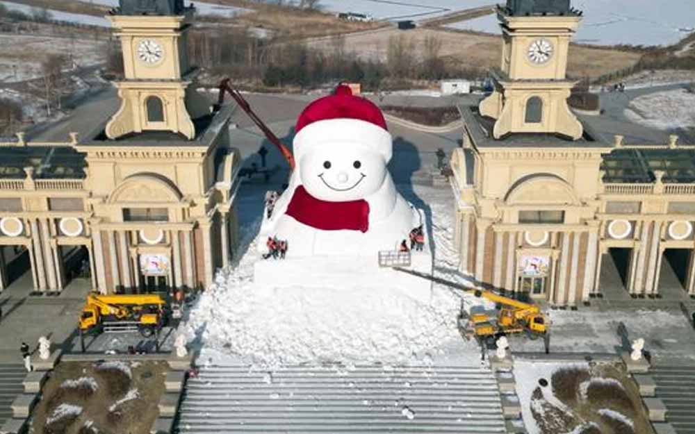 El Parque Musical Qunli trabaja en la construcción de la figura, que tiene 3.000 metros cúbicos de nieve y casi 20 metros de altura.